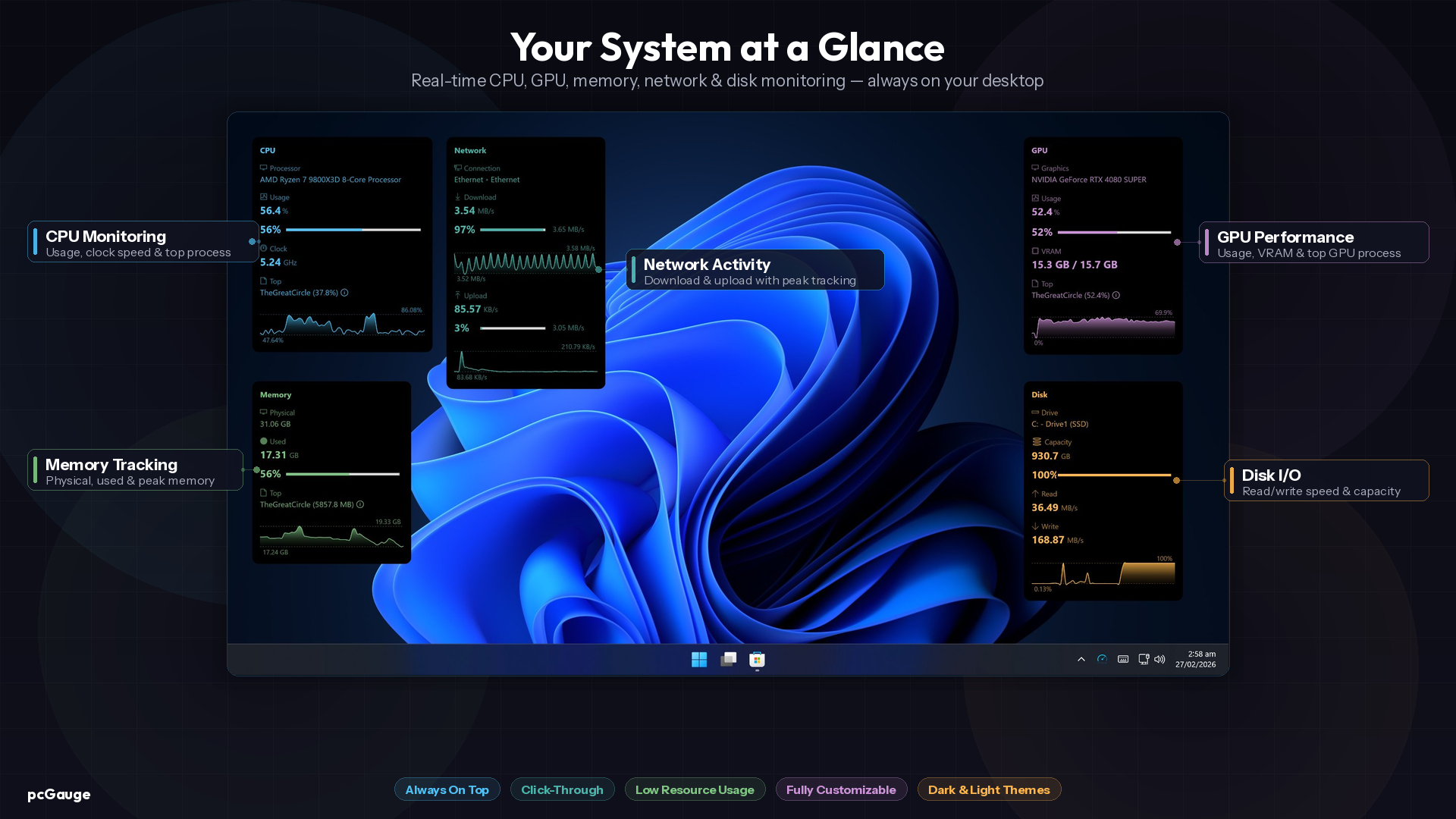The easiest way to put CPU, GPU, memory, network, and disk stats on your Windows desktop — without scripts, config files, or ugly overlays.